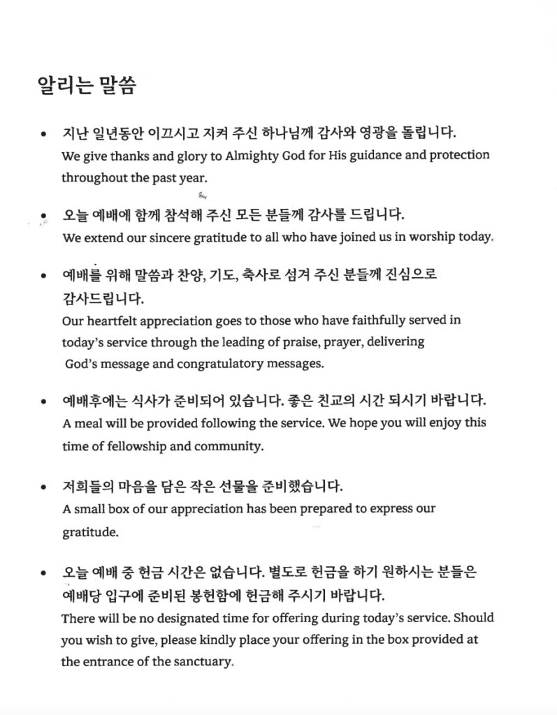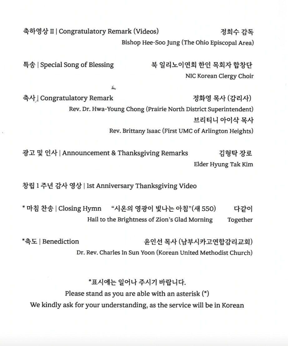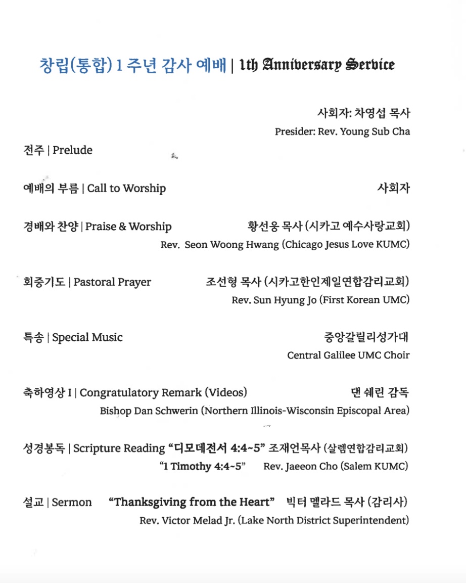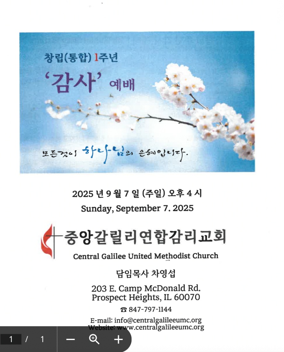 중앙 갈릴리 창립(통합) 감사 예배 주보: 9월 7일 오후 4시 (The First Anniversary Service)